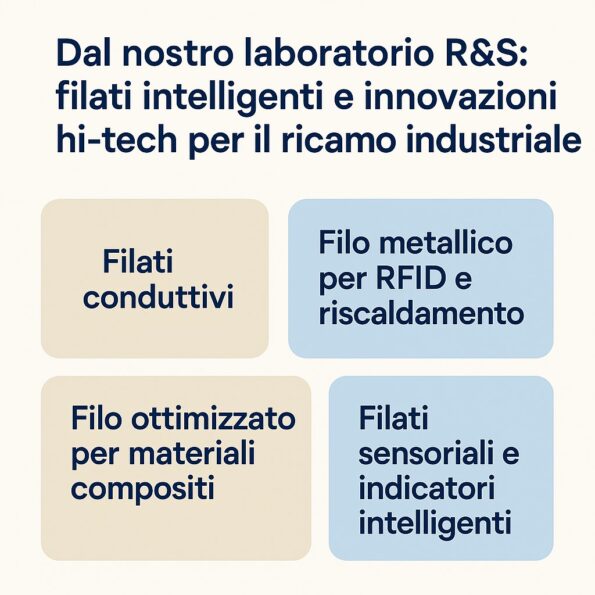 Il futuro del ricamo industriale è già realtà nel nostro laboratorio di R&S: filati che conducono, riscaldano, tracciano, rilevano e persino cambiano colore.