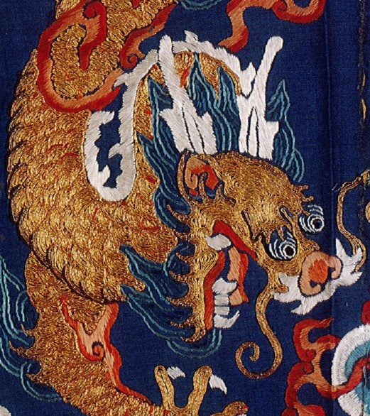 • Un drago cinese ricamato in goldwork, frammento di un abito cerimoniale: le scaglie dorate, i dettagli in seta, le curve del corpo sono un esercizio di potenza visiva. Qui il filo metallico viene lavorato con precisione millimetrica, ottenendo rilievi e riflessi straordinari.